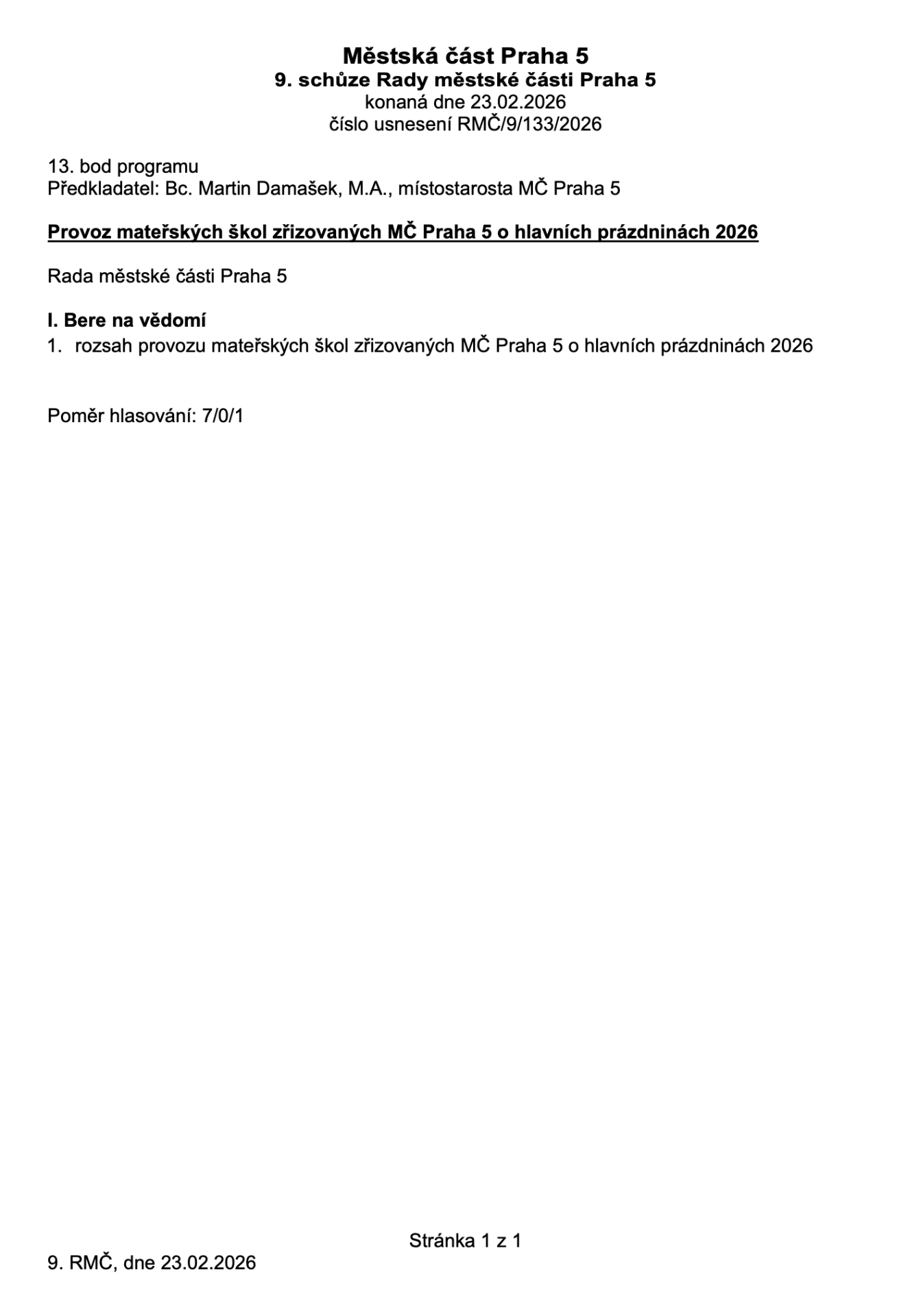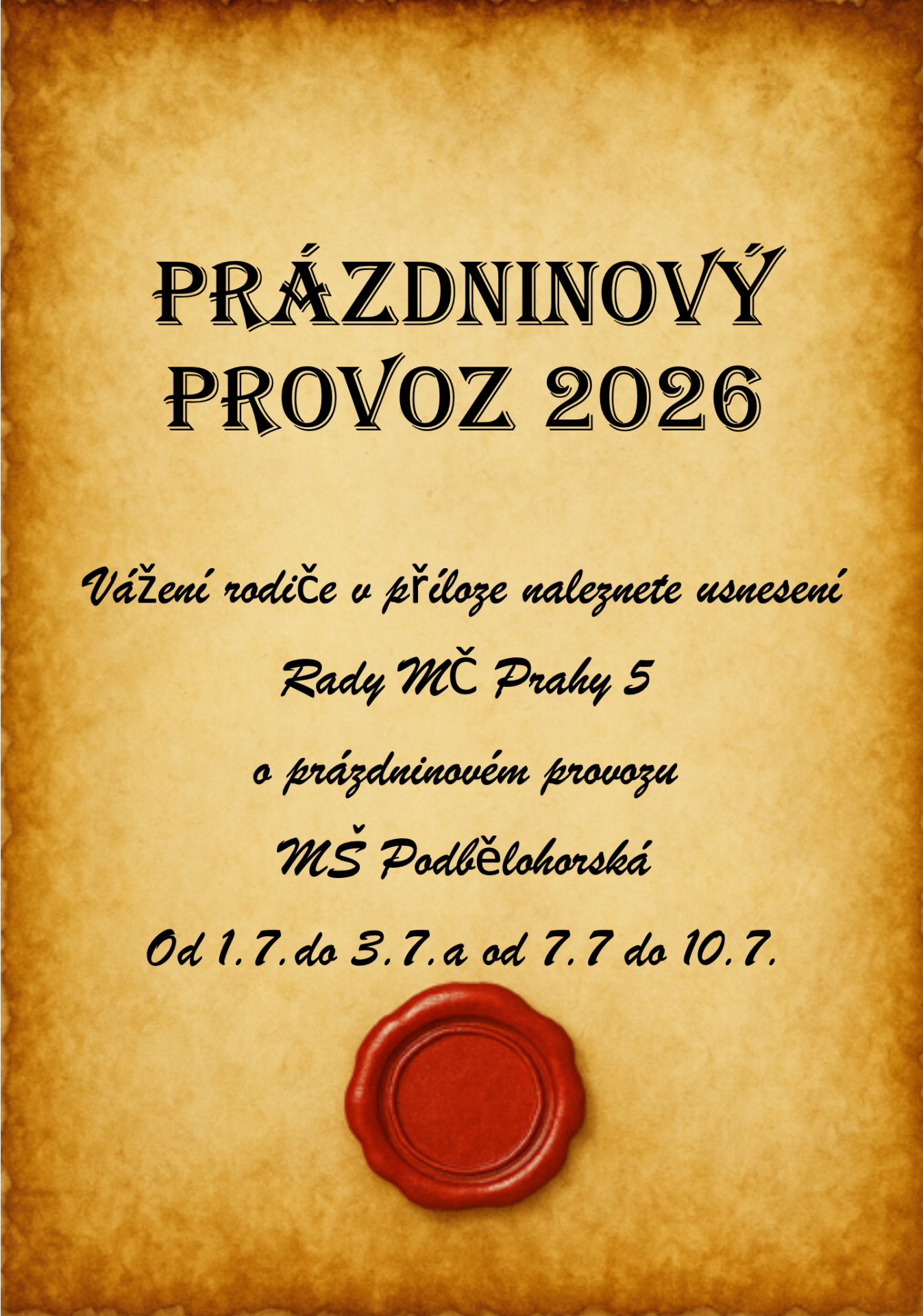 Provoz mateřských škol zřizovaných MČ Praha 5 o hlavních prázdninách 2026