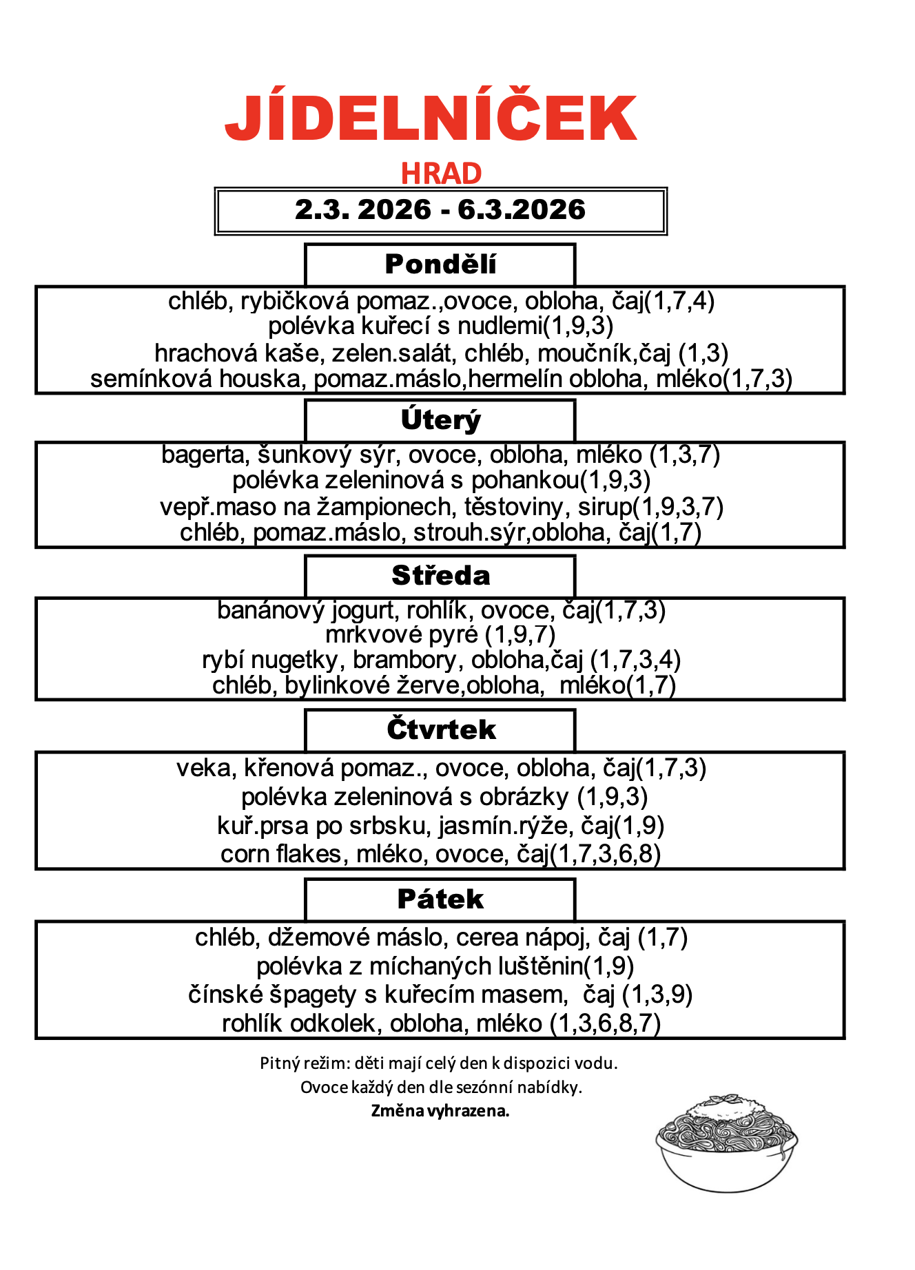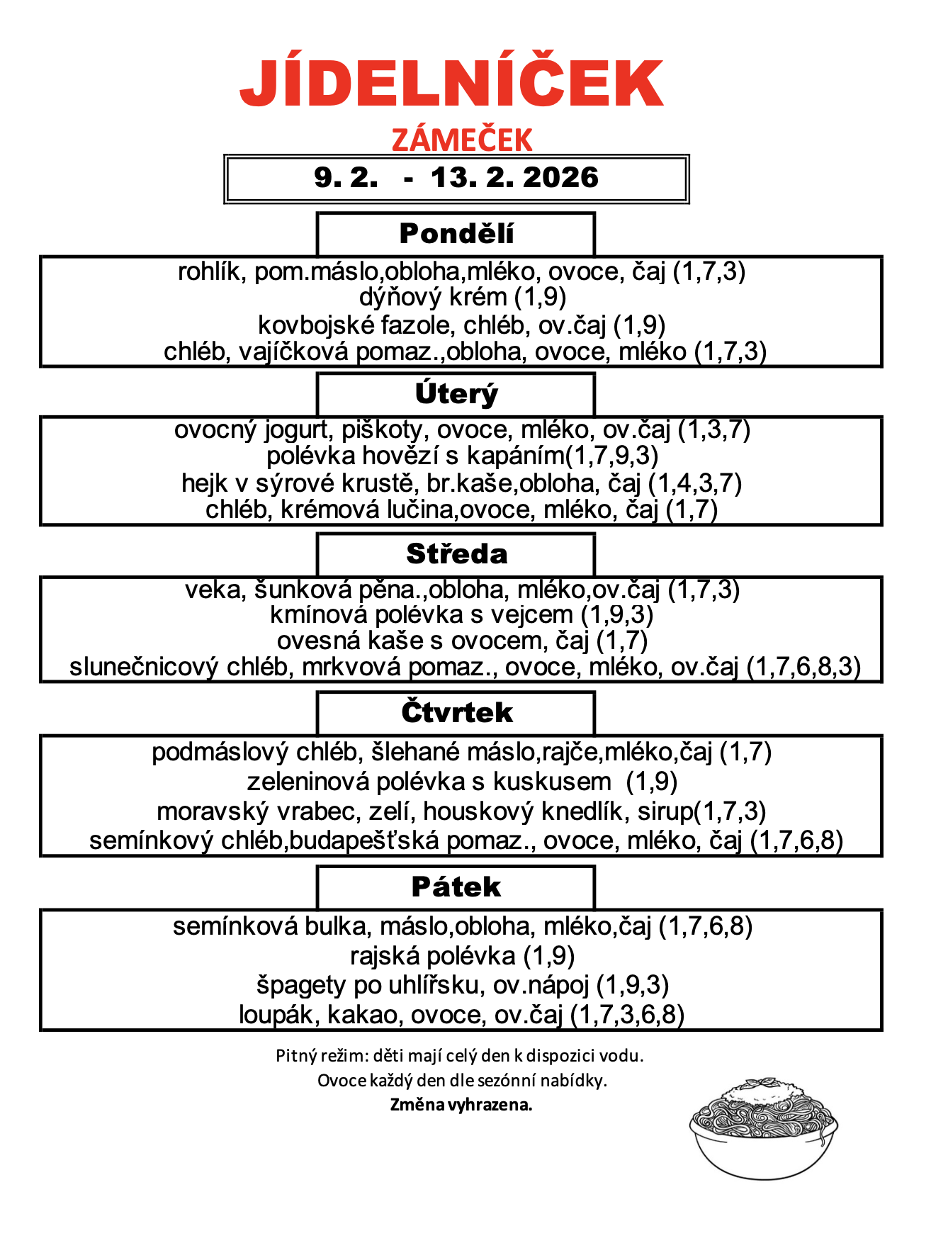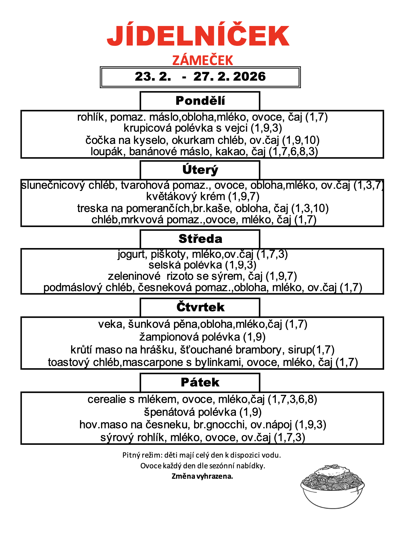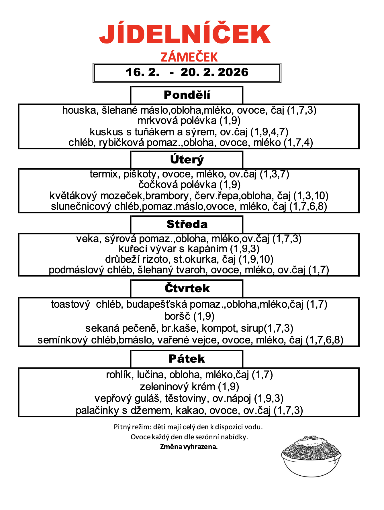 Provozní řád školní jídelny je v hale MŠ, jídelníček je vyvěšen na dveřích jídelny