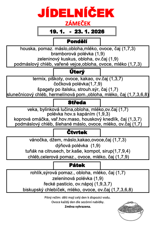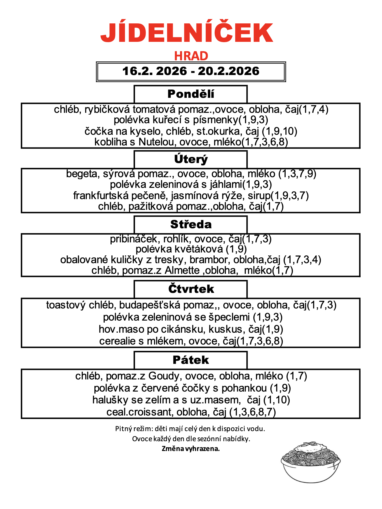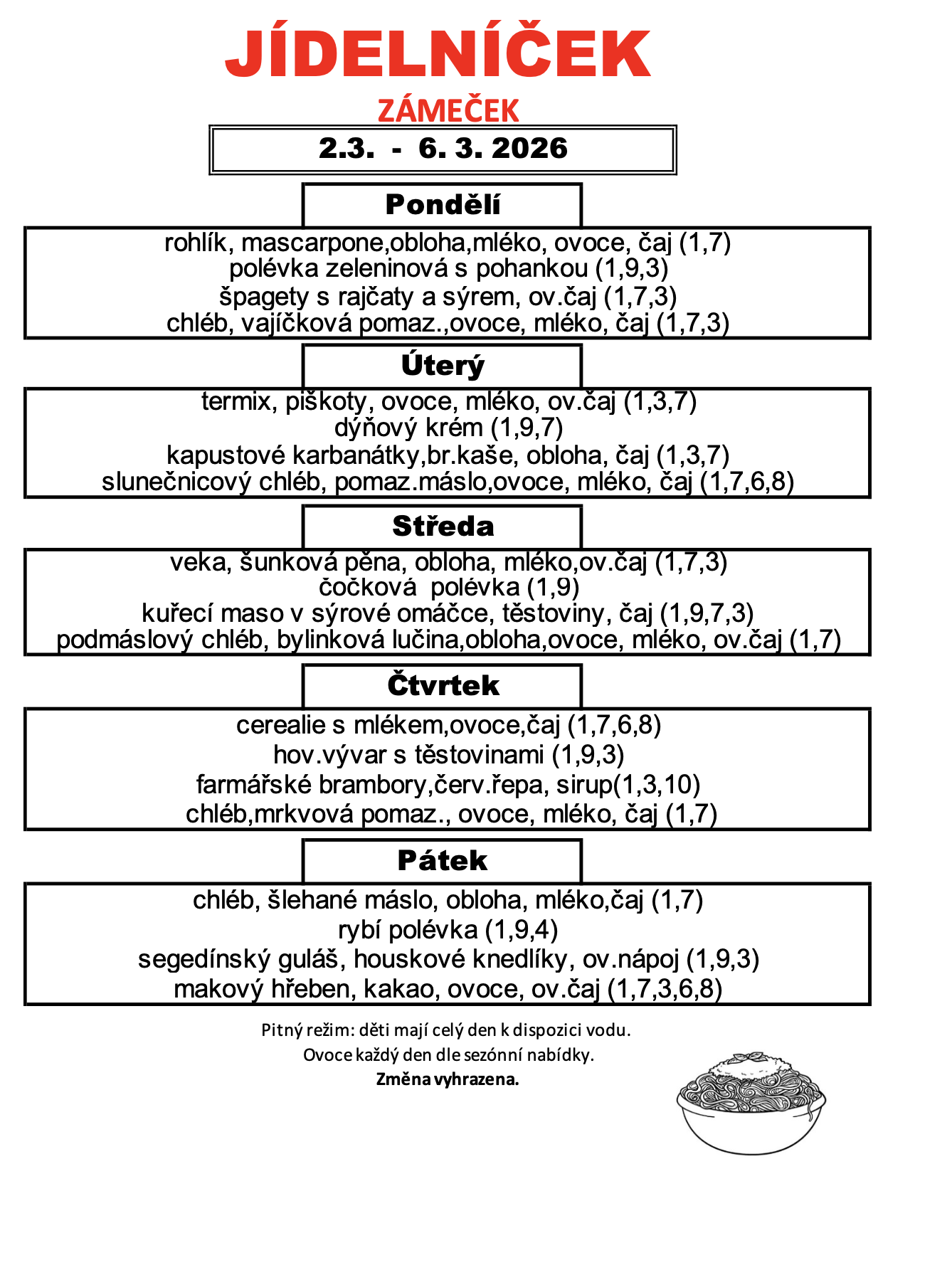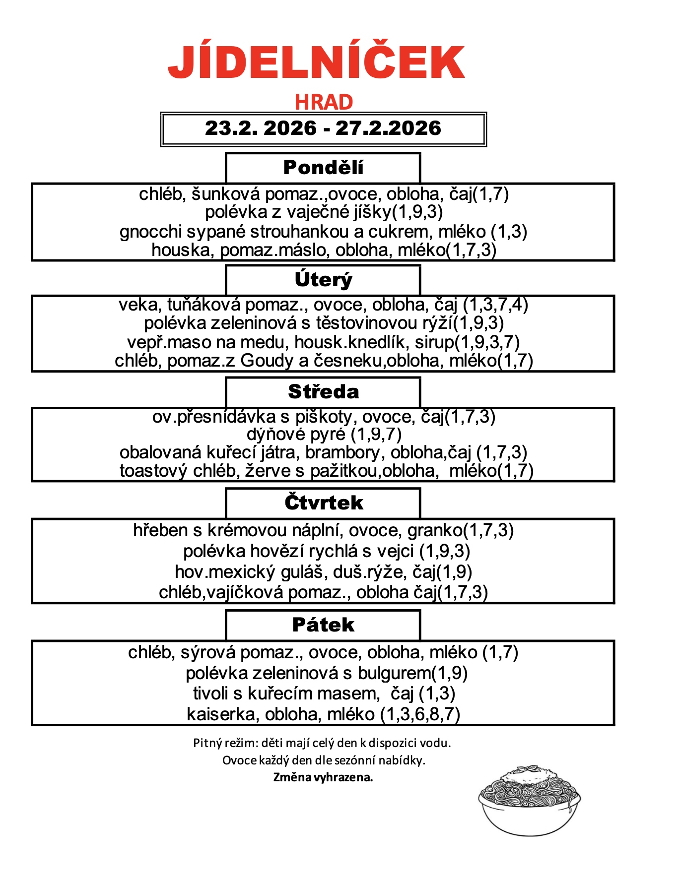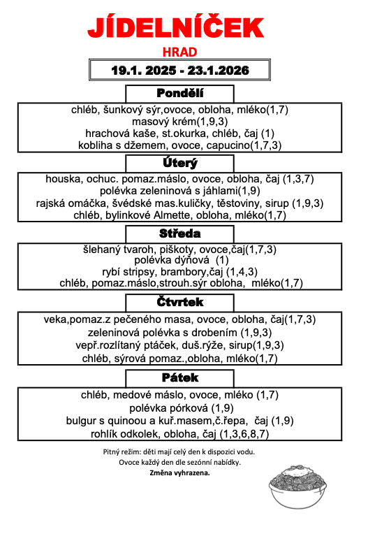 Provozní řád školní jídelny je v hale MŠ, jídelníček je vyvěšen na dveřích jídelny