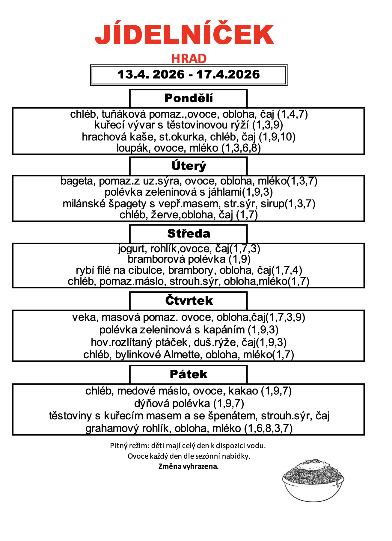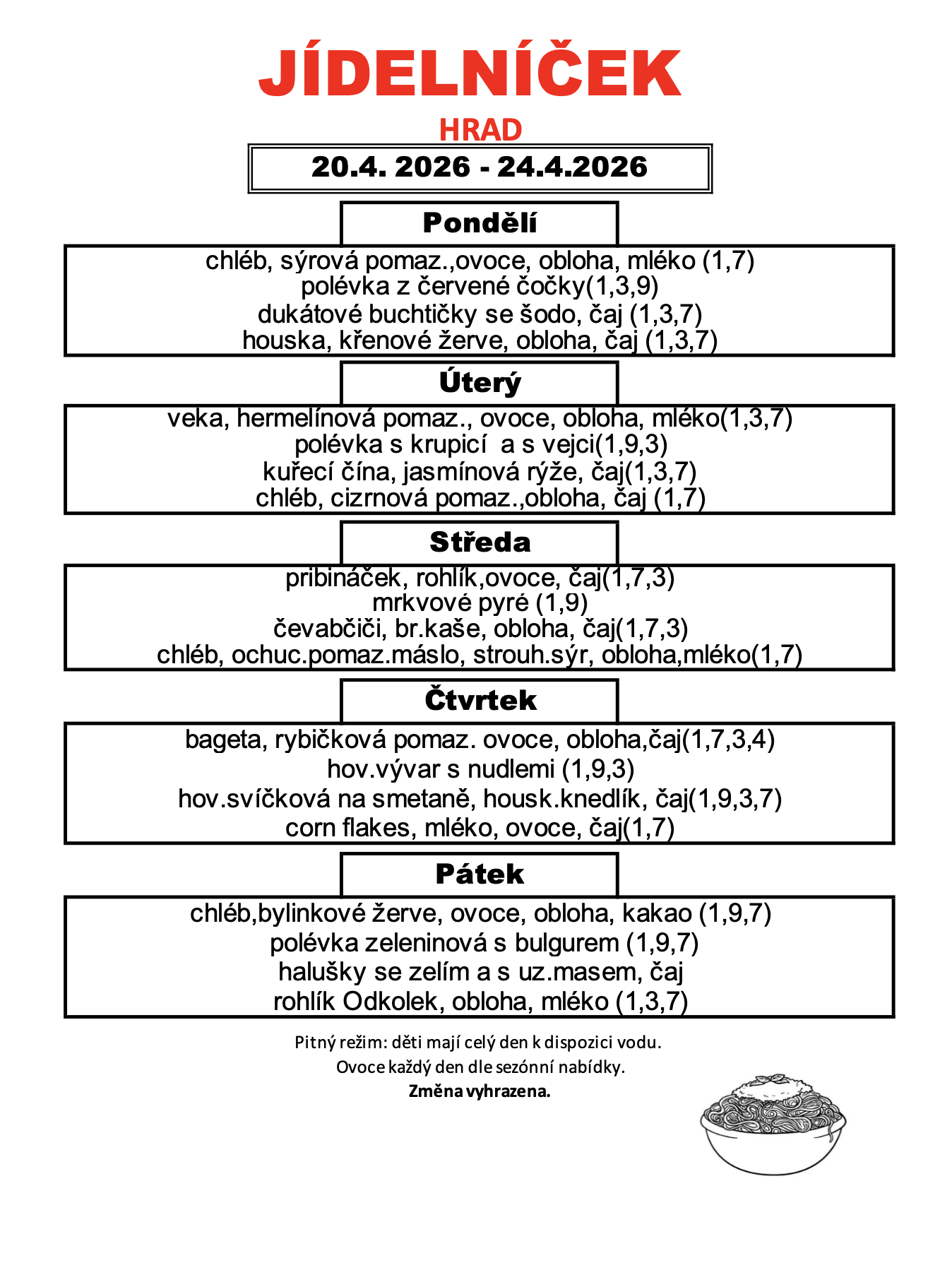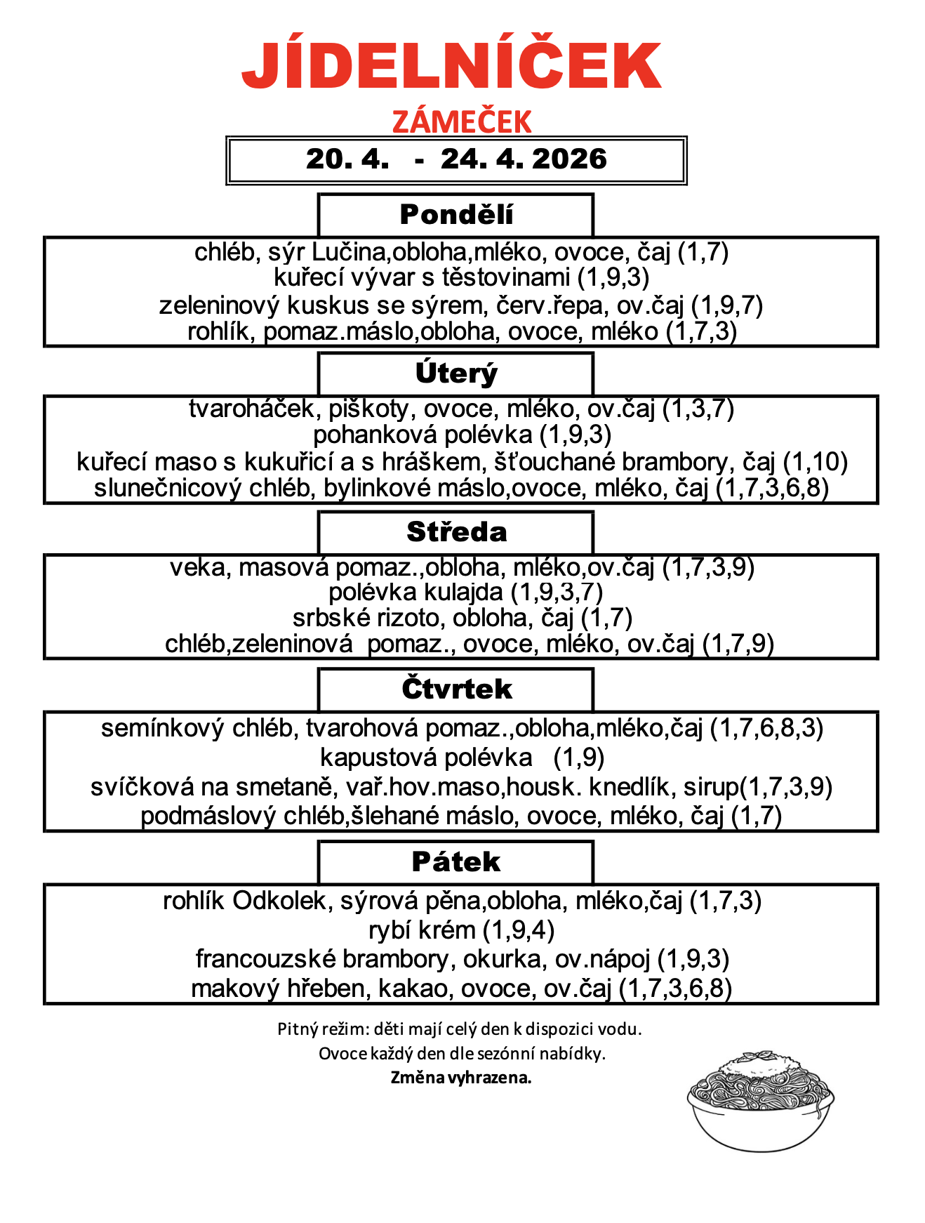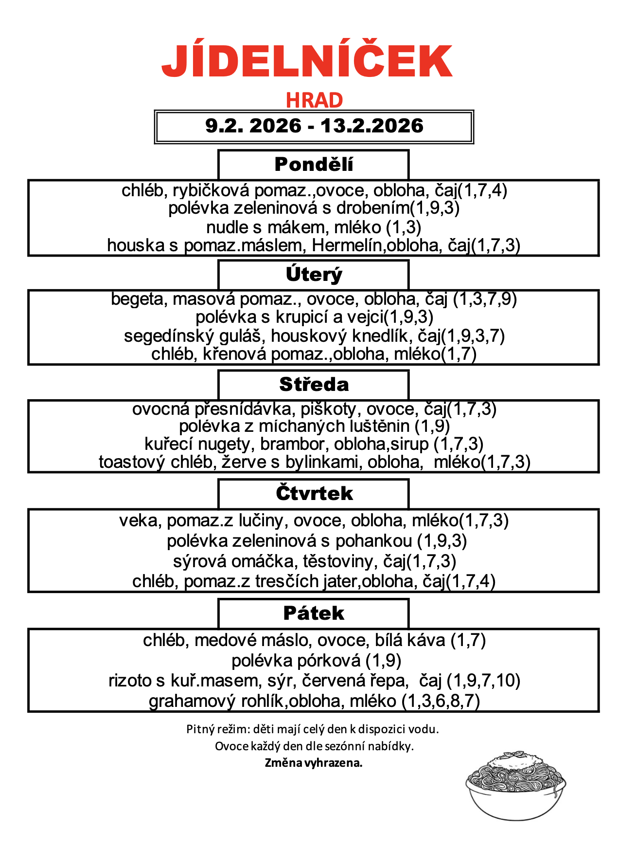 Provozní řád školní jídelny je v hale MŠ, jídelníček je vyvěšen na dveřích jídelny